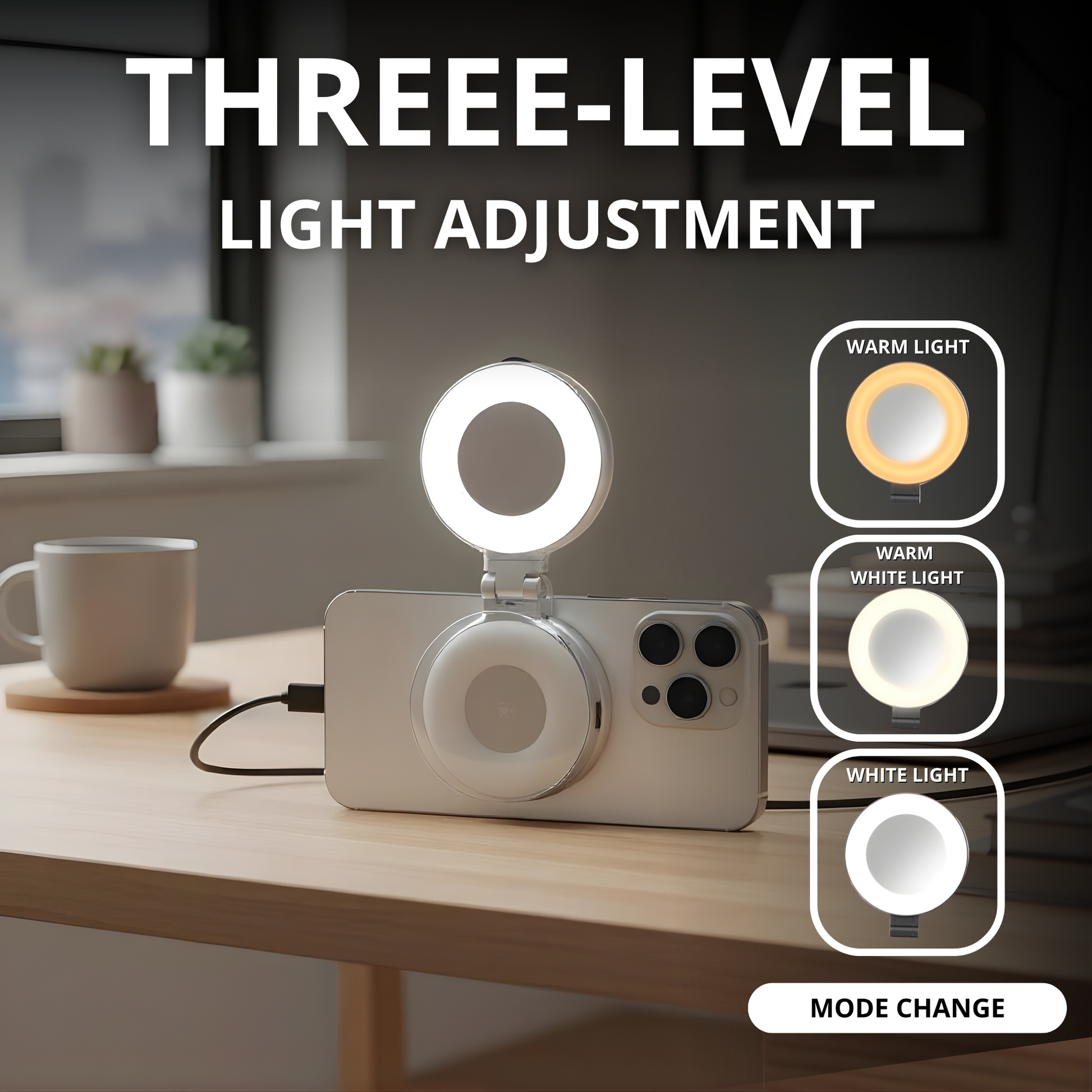 3 adjustable color modes: warm (2500K), neutral (4500K), and cool (8500K).